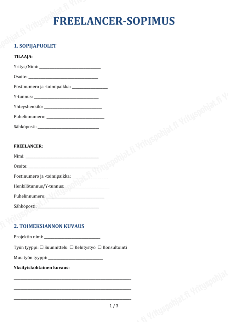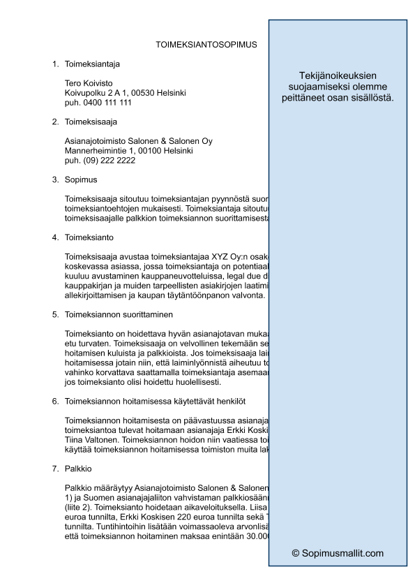 Lataa ilmainen toimeksiantosopimus pohja ja varmista, että ymmärrät omat ja toimeksiantajasi oikeudet sekä velvollisuudet. Sopimus selkeyttää yhteistyön ehdot tehokkaasti.