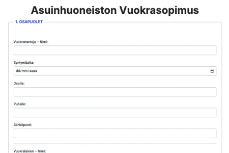 Lataa ilmainen määräaikainen vuokrasopimus pohja ja tutustu maksuehtoihin ja takuuehtoihin helposti. Täydellinen opas vuokrasopimuksen laatimiseen, joka kattaa kaikki olennaiset kohdat.