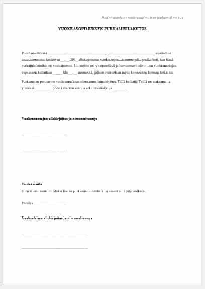 Lataa ilmainen kalustetun asunnon vuokrasopimus pohja! Selvitä, mitä laki sanoo vuokrasopimuksen irtisanomisesta ja irtisanomisajoista. Helppoa ja vaivatonta asuntoasiakkaille.